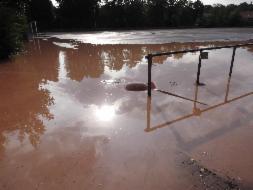 Der Gewitterregen war gerade abgezogen und hatte aus dem Platz ein Wassersportgebiet gemacht. Aber kein Problem: der Platzwart musste nur nach dem Gullideckel tauchen und den Abfluss freimachen. In wenigen Minuten war der PLatz wieder bespielbar.